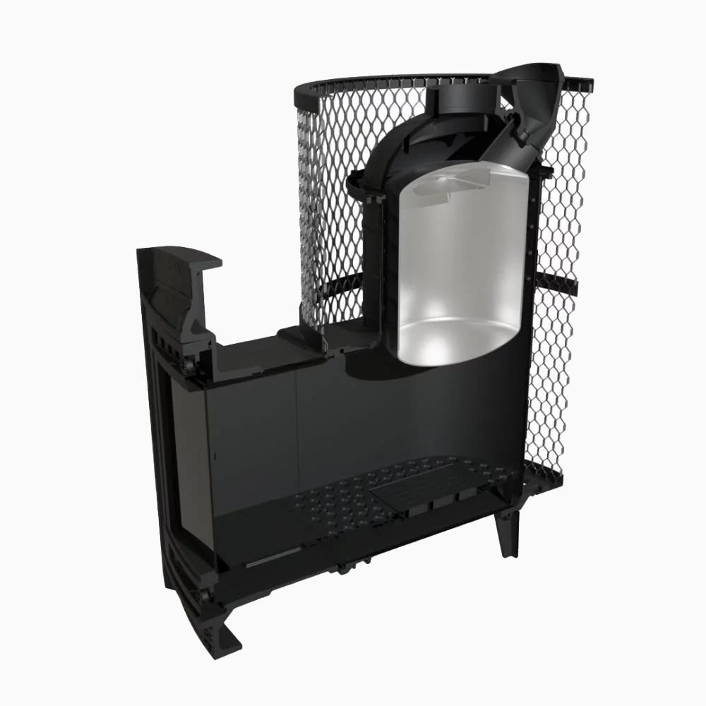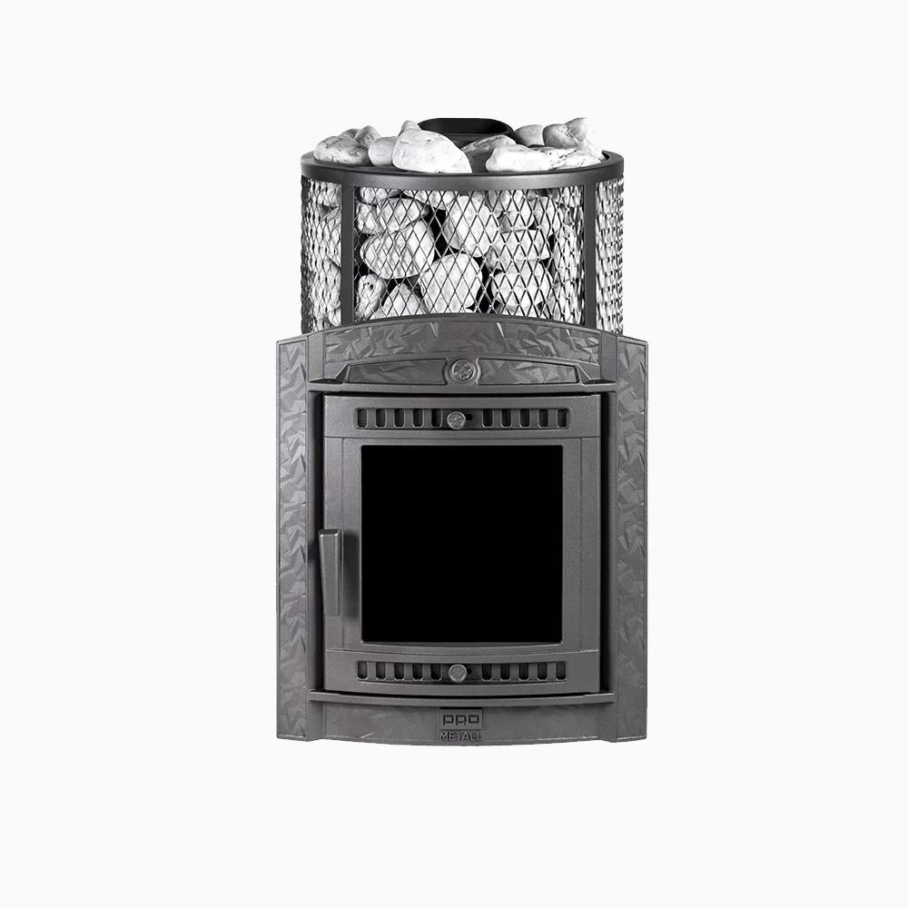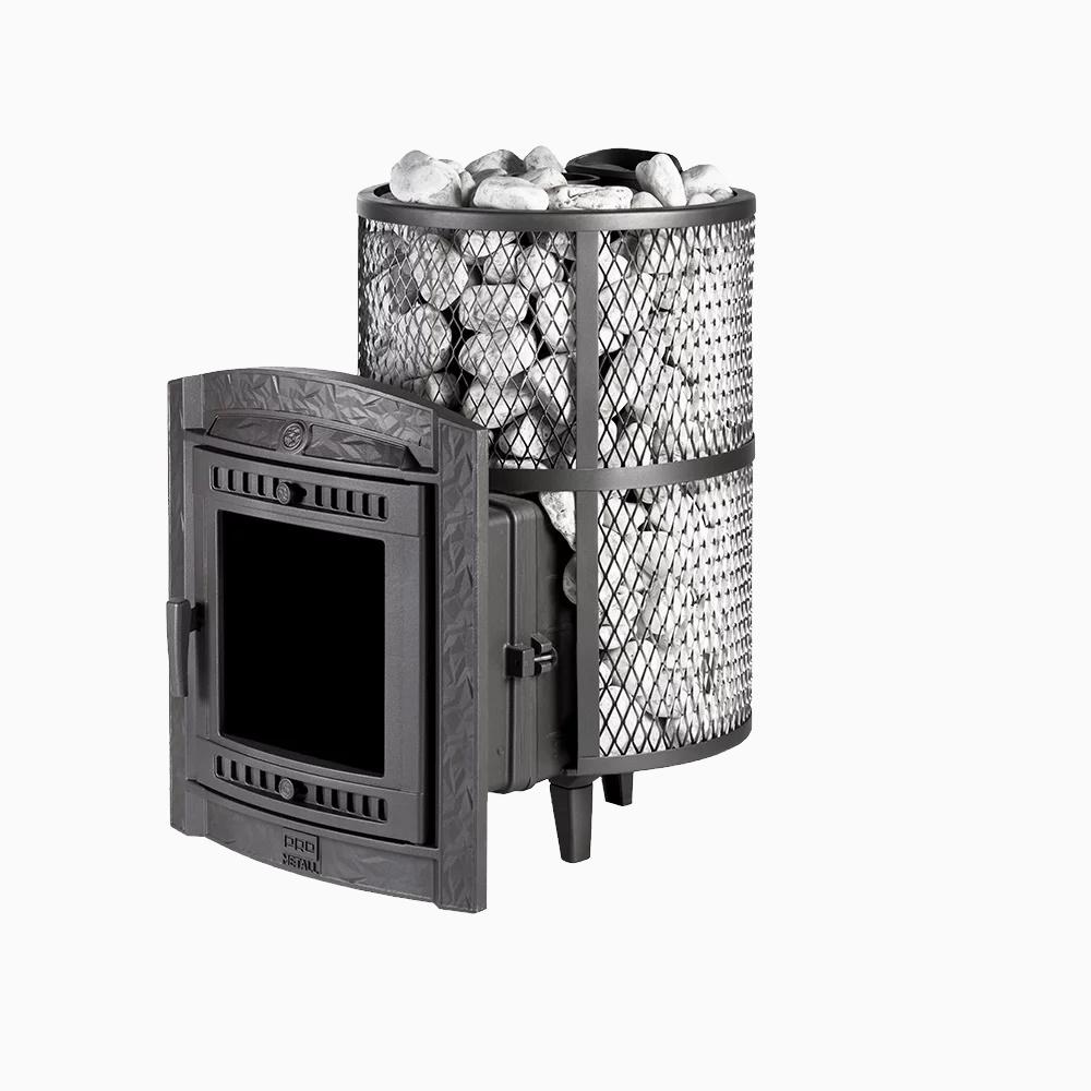 Сеточная конструкция оправдана с точки зрения экономии, и удешевляет стоимость товара на 30-40%. При этом лицевая сторона печи выглядит так же, как и в более дорогих моделях. Она так же стилизована под камин, и защищена открывающейся дверкой с жаропрочным стеклом. Во время принятия процедур можно не беспокоиться о работе оборудования, ведь оно равномерно поддерживает тепло в течение 3-4 часов от одной закладки дров! Пар получается мягким и не обжигающим, и заполняет весь объем помещения (до 20 кубометров).