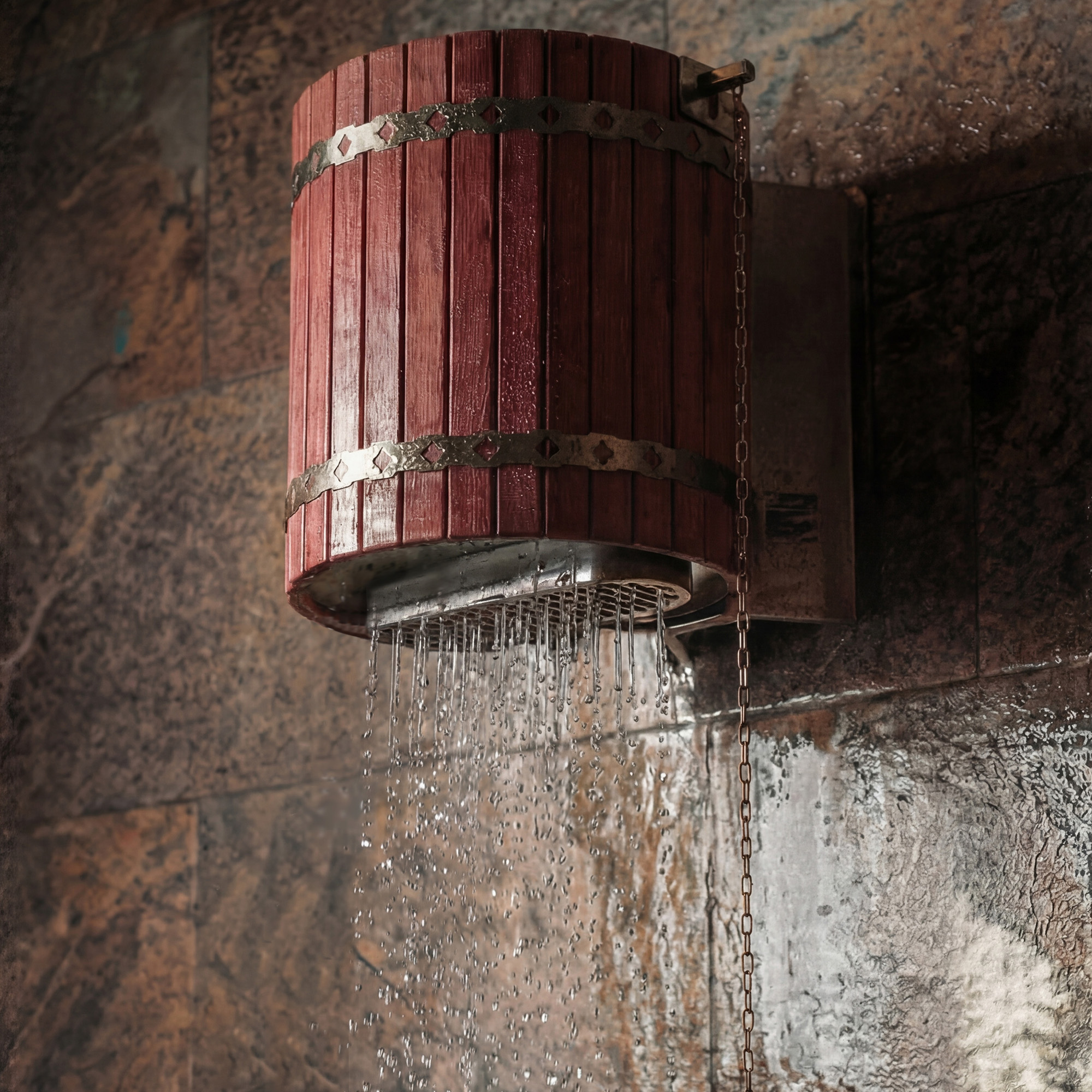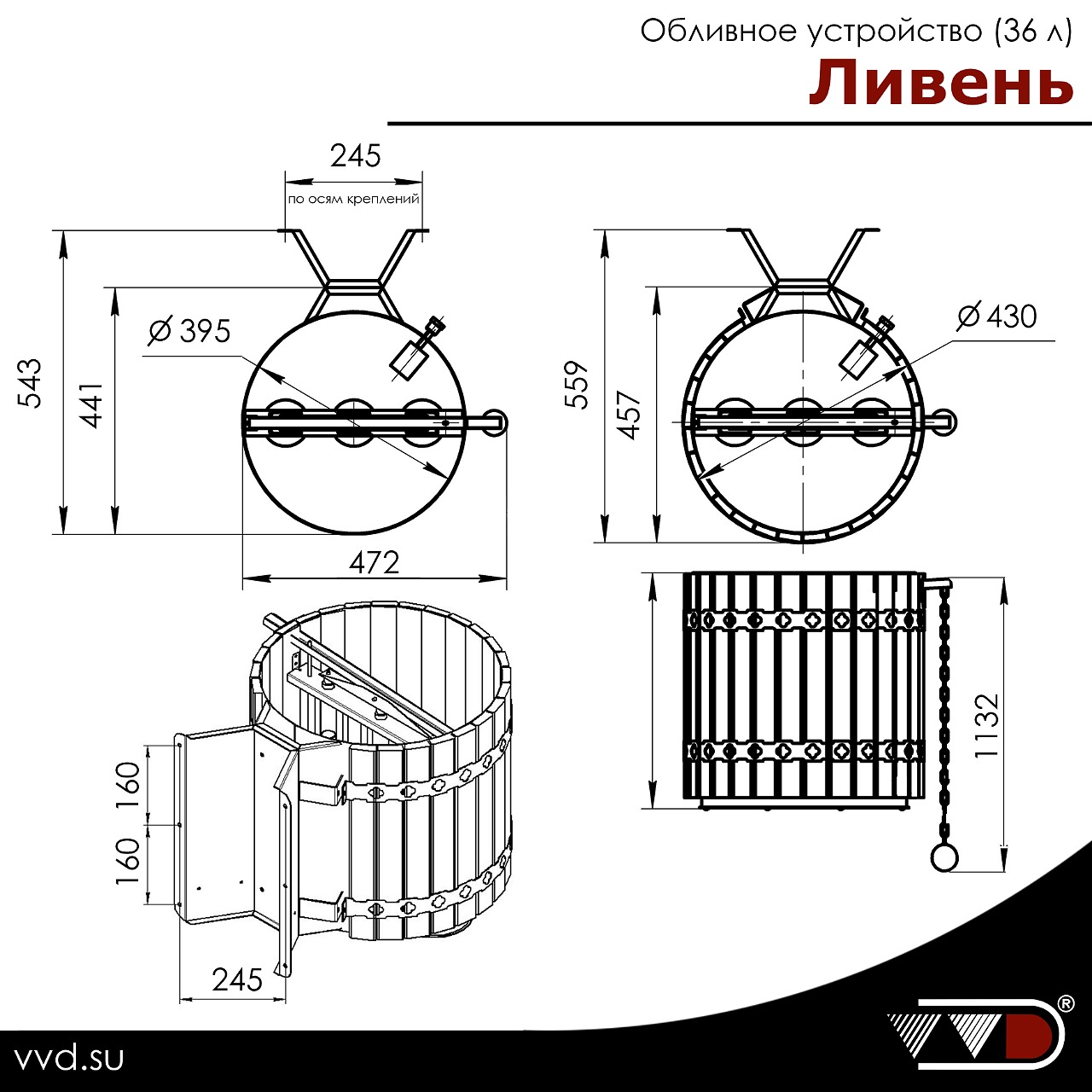 - У обычных обливных ведер объем воды составляет 10-12 литров, что явно недостаточно для эффективного и единовременного охлаждения тела. В результате возникает дисбаланс между разогретыми и охлажденными его участками. В обливном устройстве «Ливень» запас воды составляет 50 литров, что эффективно позволяет охладить тело после самого интенсивного парения. Специальный рассекатель формирует поток изливающейся воды таким образом, чтобы полностью охватить тело человека и охладить его.
