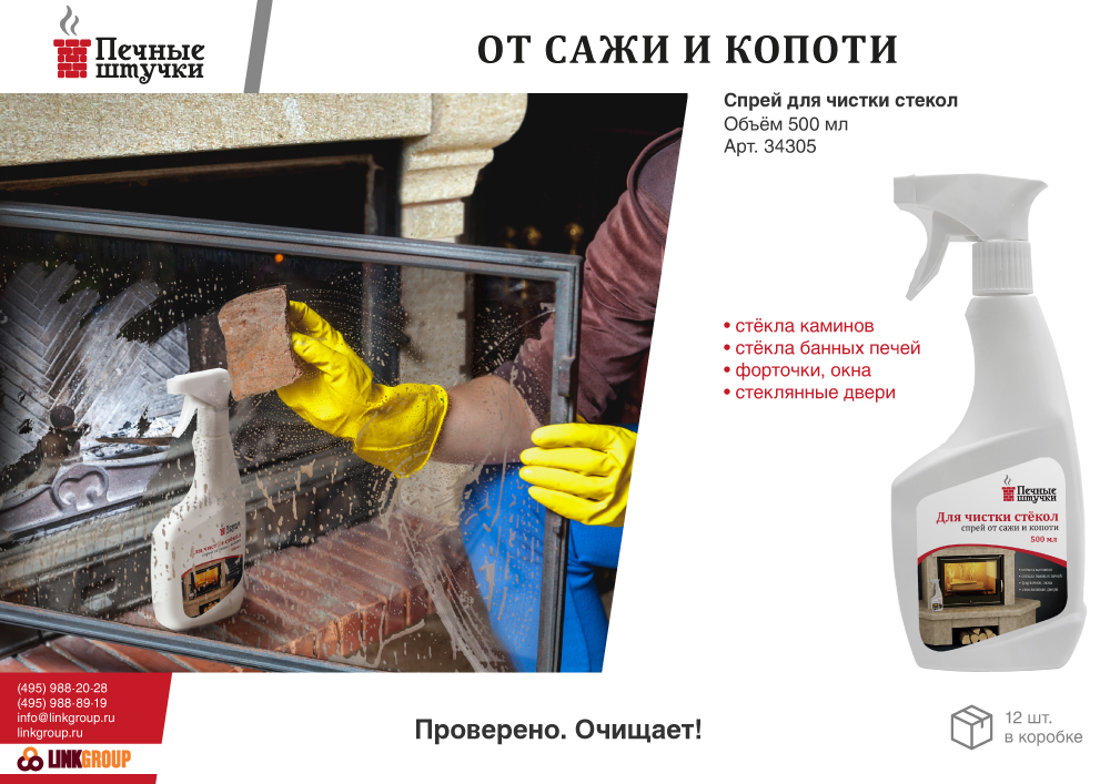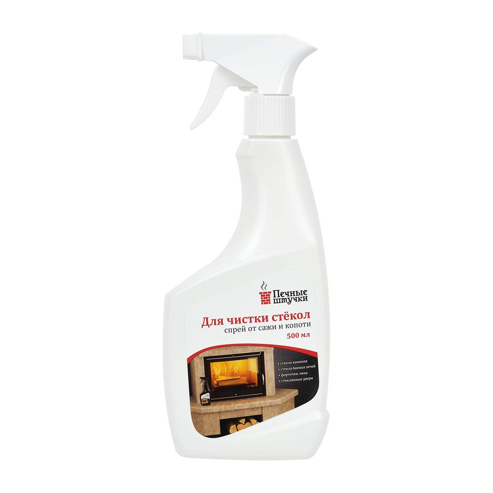Объем: 0,5 л. Спрей для очистки стекол «Печные штучки» отлично справится с удалением сажи и копоти с печных и каминых стекол. Спрей также подходит для очистки зеркал и окон.