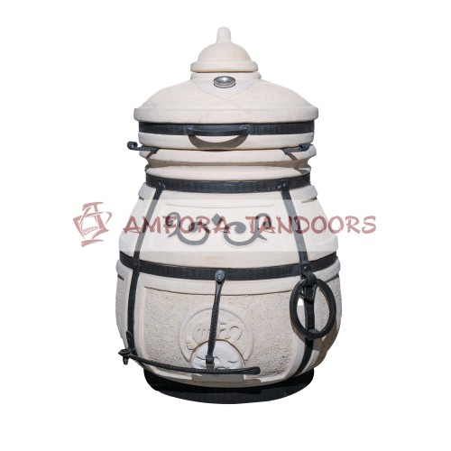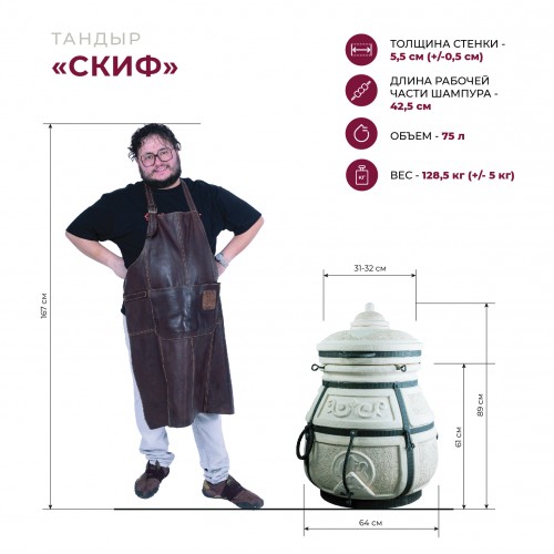 Есть вещи, которые могут служить вечно и передаваться в семье из поколения в поколение. К таковым относится тандыр Скиф, который обладает средними размерами, стандартной формой и комплектом необходимых инструментов. Благодаря металлическому каркасу с коваными ручками, его можно легко переносить с места на место. Широкая и уплощенная форма дна позволяет закладывать большее количество дров. При толщине стен в 6 см обеспечивается равномерный жар на 1,5 – 2 часа. Этого времени достаточно для приготовления еды без дополнительной растопки в несколько заходов. Внутренний объем вмещает 12 шампуров. В тандыре можно готовить также овощи и выпечку — и все это быстро, без особых усилий. В глиняной печи, изготовленной по уникальной технологии, готовится еда на “мягком” огне, при постоянной, ровной температуре. Чтобы растопить тандыр Скиф можно использовать любые дрова — от маленьких веточек до средних поленцев, которые бы поместились внутри. Керамические стенки современных тандыров обладают хорошей и равномерной теплоотдачей. Температура одинакова в любой точке печи. Благодаря этому свойству еда не подгорает, а как бы напитывается теплом и готовится изнутри, обеспечивая качественную прожарку. В тандырах пища не только приобретает тонкий вкус и нежный аромат, но и сохранят полезные свойства.